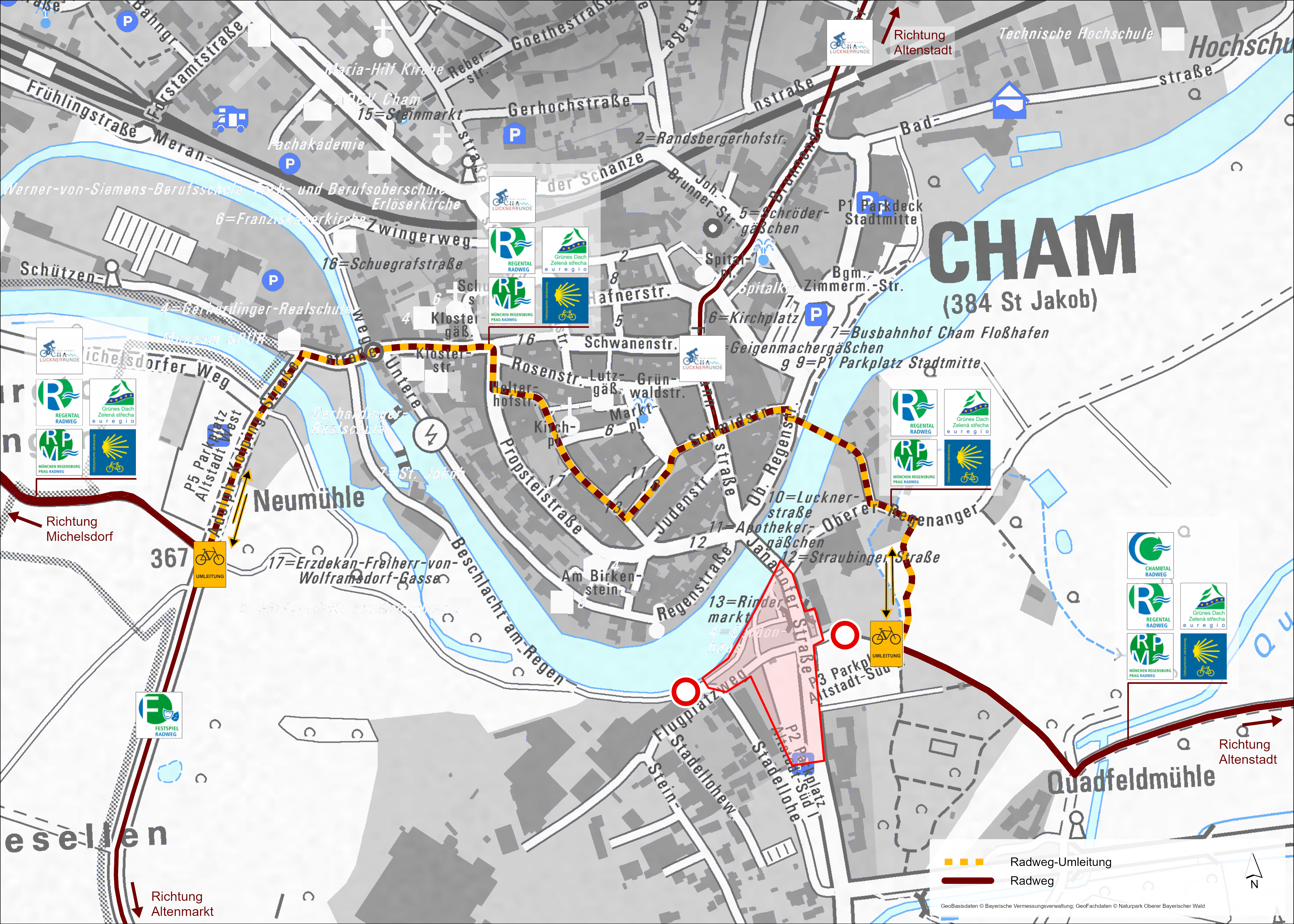 [HINWEIS: Aufgrund von Bauarbeiten an der Flutbrücke Stadellohe bis ins Jahr 2026 werden die Radwege über die Altstadt Cham umgeleitet. Die Umleitung ist ausgeschildert! HINWEIS] Die 38,3 km lange Große Luckner Runde beginnt am Chamer Marktplatz und führt über die Straubinger Straße vorbei am Geburtshaus des Namensgebers – Graf Luckner - sowie über die Regenbrücke bei der Janahofer Straße zu den überörtlichen Radwegen entlang des Flusses Regen Richtung Roding. Bis zum Schwalbenhaus in Untertraubenbach, wo sich die Radwege nun voneinander trennen, ist die Luckner Runde nicht extra ausgeschildert, sondern folgt der überörtlichen Radwegbeschilderung. Der Beschilderung nun nach links folgend, geht es über Thierlstein und Ried am Pfahl zur Überführung der B85. Diese wird überquert. Danach geht es sofort links in einen Begleitweg der B85. Schon nach 100 m, verlässt man diesen, um nach Stadl und Brunn zu kommen. In Brunn trifft man auf den Festspiel-Radweg, den man über Haidhäuser und Altenmarkt folgt. In Altenmarkt trennen sich die beiden Radwege wieder und die Luckner Runde geht geradeaus weiter über die Rodinger Straße, Mittelweg und Vilzinger Straße. Entlang dieser verläuft ab dem Sperberweg ein ausgebauter Radweg, den man bis zum Ortseingang Tasching nutzt. Vor den ersten Häusern hält man sich nach links und biegt in die Gutmaninger Straße rechts ein. Beim nächsten Abzweig wird der Kreisstraße CHA 17 nach links für 400 m gefolgt. Nachdem geht es rechts Richtung Hof und anschließend über den Neubruchweg und einer weiteren kleinen Asphaltstraße zum Fuß des Lambergs. Hier besteht die Möglichkeit einen Abstecher zum Gipfel mit Wallfahrtskirche und Wirtshaus zu machen. Der Lamberger Straße und Pfarrer-Mandl-Straße folgend, trifft man auf die Urkirche in Chammünster. Hier orientiert man sich an der Beschilderung nach links in Richtung Norden zu den Flüssen Regen und Chamb. Man trifft bald wieder auf die überörtlichen Radwege. Mit diesen zusammen geht es weiter über Kammerdorf, Selling und Kothmaißling. Nördlich des Bahngleises trennen sich nun die Radwege wieder. Die Große Luckner Runde hält sich nach links. Über Windischbergerdorf und dem Naturdenkmal Schwedenschanze kommt man zurück nach Altenstadt. Hier folgt man der Altenstadter Straße bis zur Einmündung in die Further Straße. Linker Hand geht es über über Brunnendorf, Spitalplatz, Fuhrmannstraße über die Schmidstraße zum Ausgangspunkt am Marktplatz in Cham. Die Große Luckner Runde ist in Großteilen identisch mit der Luckner Runde. Nur in zwei Abschnitten (Erweiterung Lamberg und Erweiterung Kothmaißling) weicht sie von der 25 km langen Luckner Runde ab. Die Erweiterungen sind nicht extra ausgeschildert.